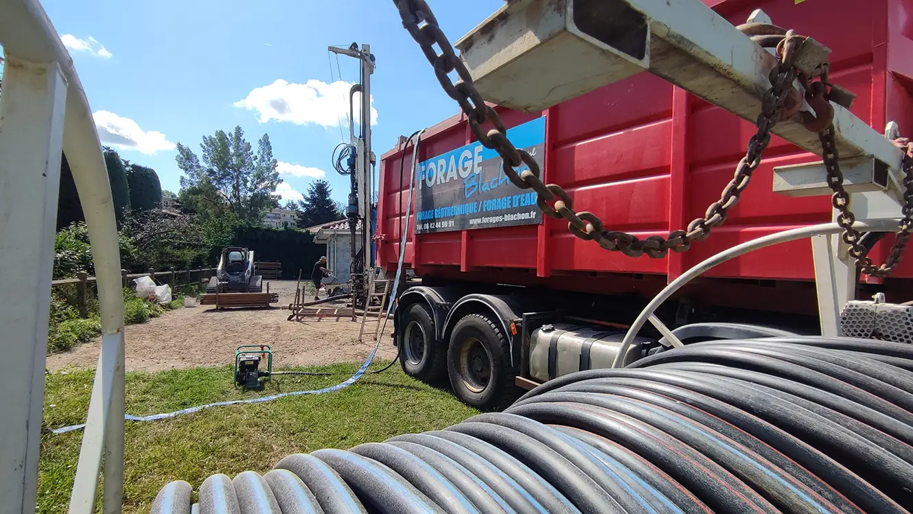 La géothermie profonde a été utilisée pour les besoins de chauffage de la maison. Des forages descendus à -80m ont été réalisés par l’ets Blachon. Une pompe à chaleur y a été raccordée. La maison tire parti de la chaleur naturelle du sol, assurant une température agréable tout au long de l’année tout en réduisant considérablement l’empreinte carbone.